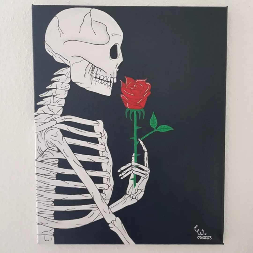 Mit einer Rose für die Ewigkeit in der Hand verweilt dieses Skelett jetzt in seinem neuen Zuhause in Hamburg.